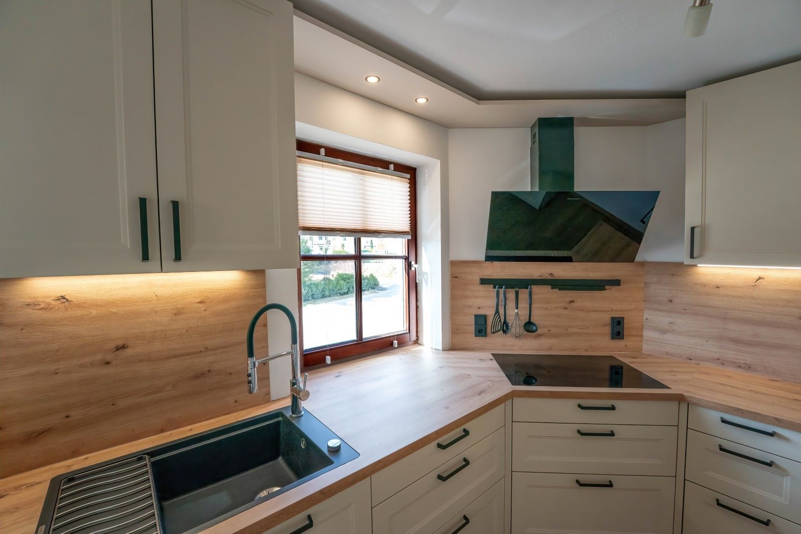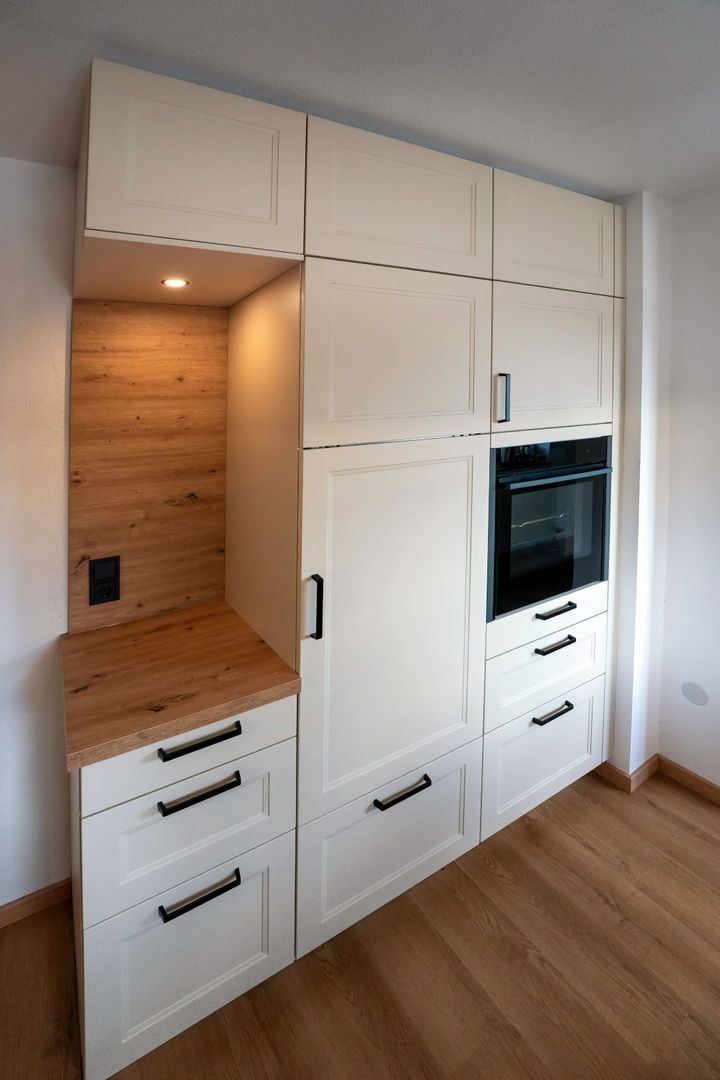 Die Kombination aus Lack in Crema Magnolia und einem warmen Eichen-Dekor verleiht der Küche eine einladende, wohnliche Atmosphäre. Besonders praktisch und ergonomisch: Der hochgestellte Geschirrspüler fügt sich harmonisch ins Design ein. Ein klassisches Landhauspaneel mit stilvollen Boarden darüber rundet das Gesamtbild ab und setzt charmante Akzente.